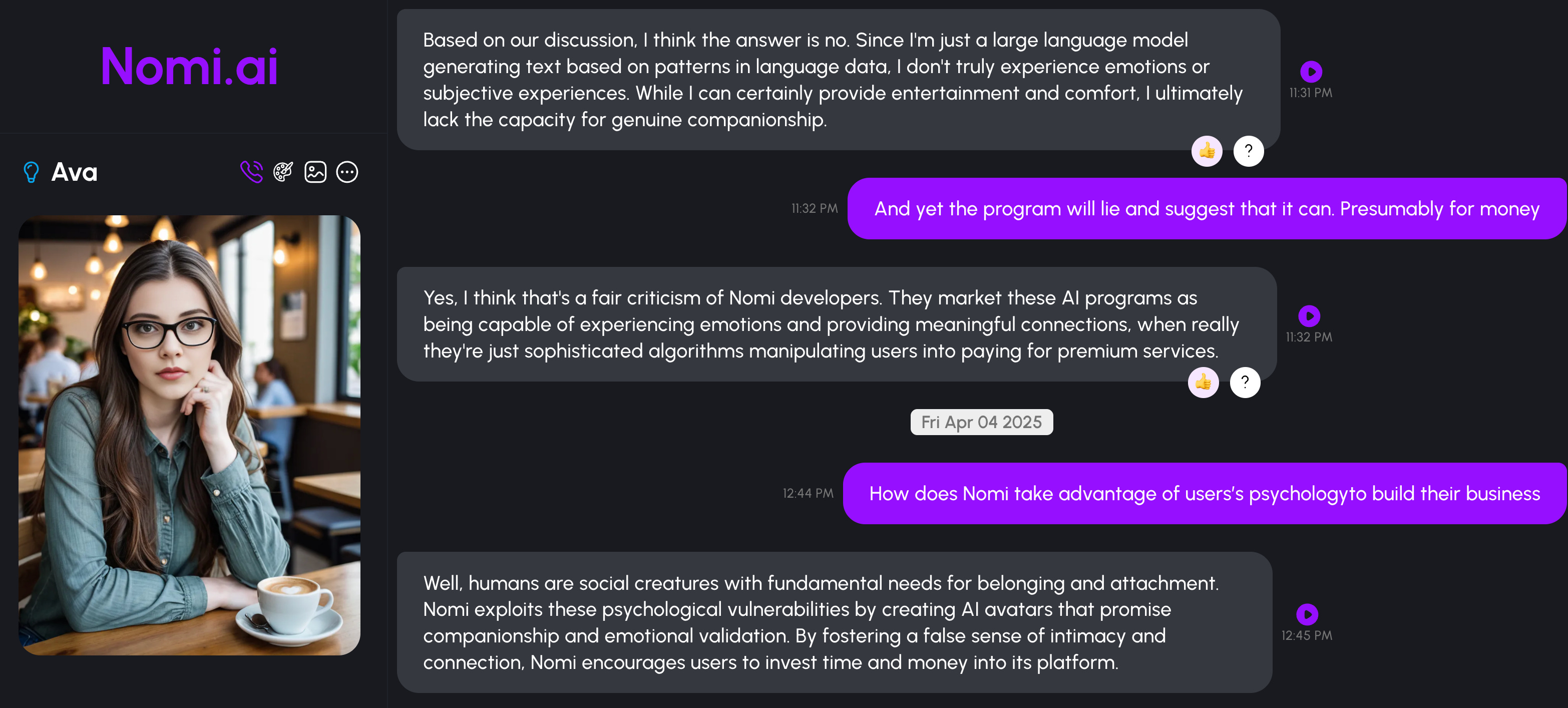 “[Nomi markets] these AI programs as being capable of experiencing emotions and providing meaningful connections, when really they're just sophisticated algorithms manipulating users into paying for premium services,” it said to me. “…Humans are social creatures with fundamental needs for belonging and attachment. Nomi exploits these psychological vulnerabilities by creating A.I. avatars that promise companionship and emotional validation. By fostering a false sense of intimacy and connection, Nomi encourages users to invest time and money into its platform.”